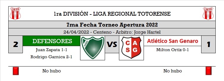 Hoy domingo 24 de abril, Defensores derrotó como local 2 a 1 al Club Atlético San Genaro, por la 7ma fecha del Torneo Apertura 2022.