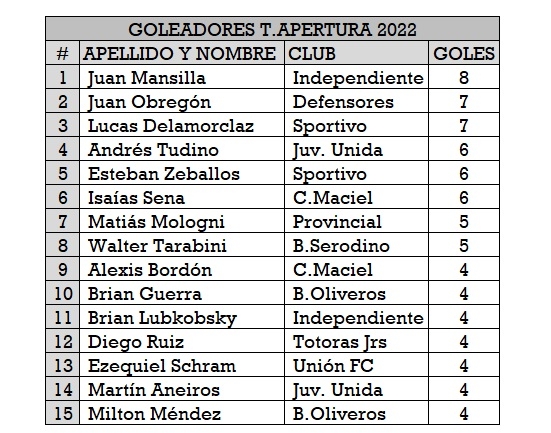Los tantos fueron convertidos por Juan Obregón en la primera parte, Fabricio Arias, Brian Núñez y nuevamente Juan Obregón en el complemento.