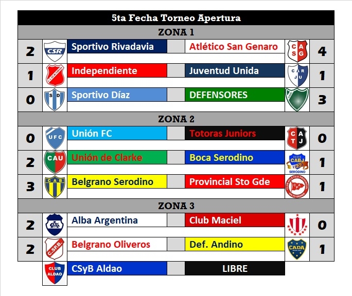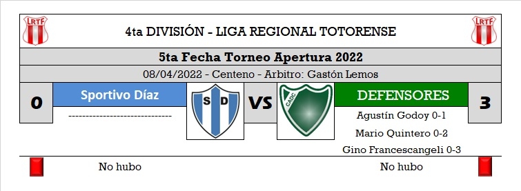 Este domingo 10 de abril se disputó la 5ta fecha del Torneo Apertura 2022 de la Totorense. El encuentro entre Sportivo Díaz y Defensores se disputó el viernes en cancha de Atlético.