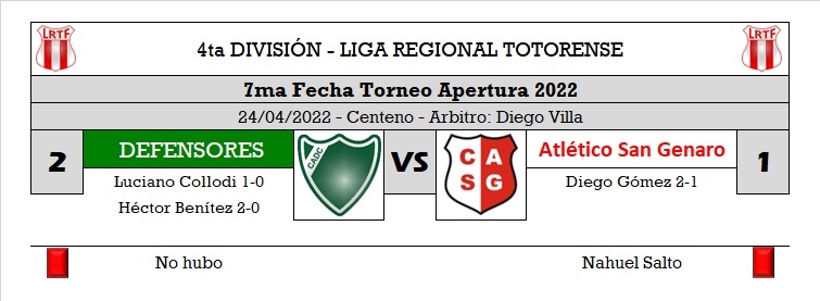 Por la 7ma fecha del torneo Apertura de la Totorense, éste domingo 24 de abril, la 4ta división verde derrotó como local 2 a 1 al Club Atlético San Genaro.