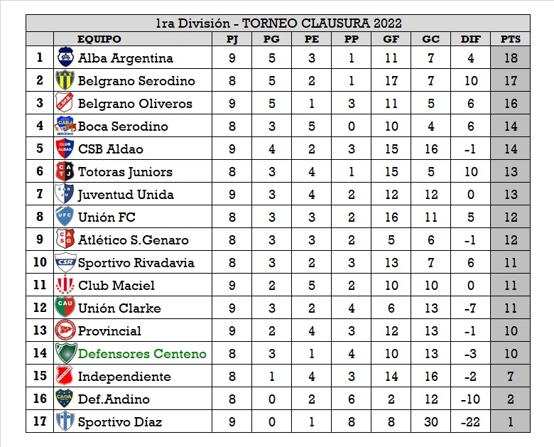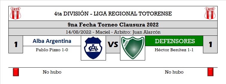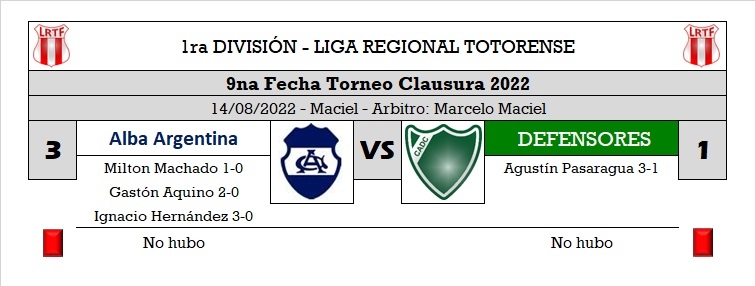El domingo 14 de agosto se disputó la 9na fecha del Torneo Clausura 2022 de la Liga Regional Totorense de Fútbol, dónde Defensores visitó a Alba Argentina de Maciel.